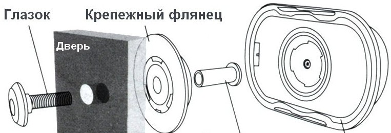 Дверной глазок состоит из объектива и окуляра, помещённых в металлический корпус