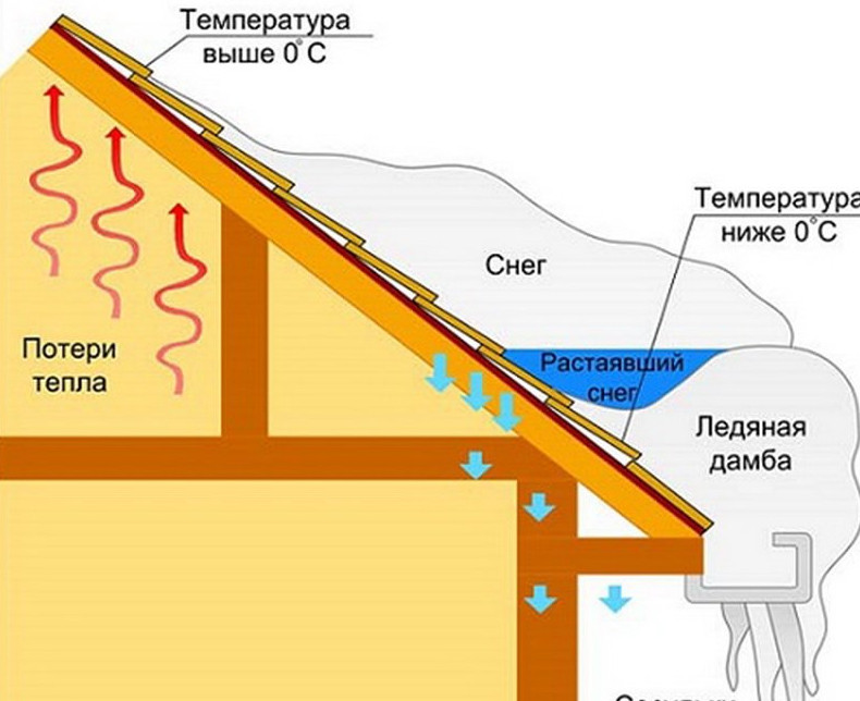Если крыша плохо утеплена, нижние слои снега начинат подтаивать, в результате чего образующаяся вода стекает по скату и замерзает на карнизах и в водостоках