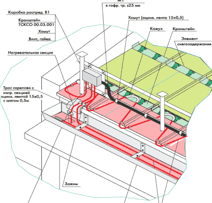 - Электрический подогрев. На нижний край кровли устанавливают специальный тепловой кабель, который не позволяет образовываться льду. На кабель также придётся потратить значительные средства, а для его установки приглашают специалистов. Для того чтобы вода сходила с крыши, необходимо делать и обогрев водостоков. Для устройства снеготаяния могут использоваться два вида кабеля: