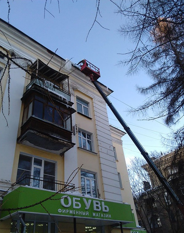 Для того чтобы достать до сосулек на крыше высокого дома, можно использовать гидравлический подъемник