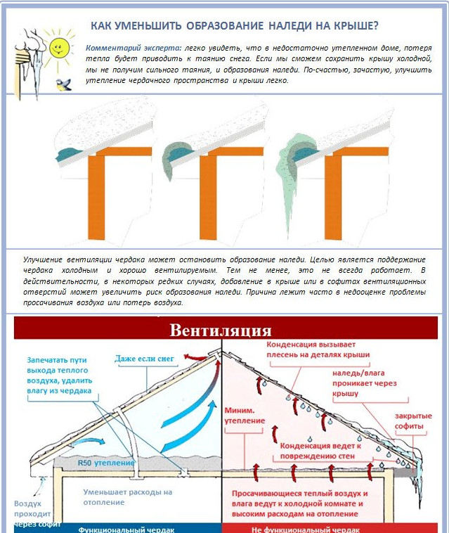 Основное условие, при котором наледь на крыше не будет образовываться, — поддерживание отрицательной температуры её поверхности. Это достигается за счёт утепления чердачного помещения или подкровельного пространства, чтобы тепло от дома не попадало на кровельный материал. В таком случае крыша в зимний период будет покрываться снегом, а лёд на ней образовываться не будет.