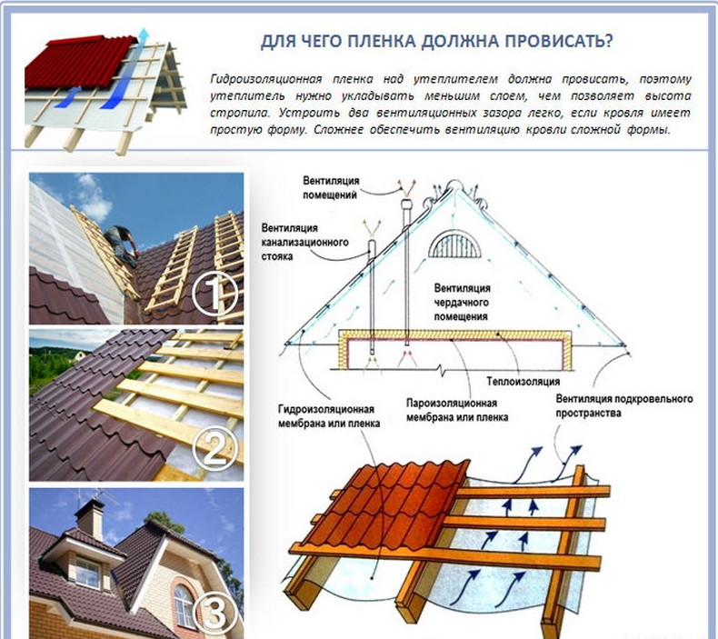 Гидроизоляционные плёнки прокладываются с провисанием по центру межстропильного пространства для обеспечения свободной циркуляции воздуха в подкровельном помещении