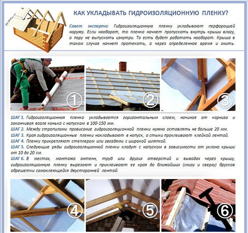 При использовании перфорированной гидроизоляционной плёнки важно уложить её правильно — перфорацией наружу. Иначе плёночный гидроизолятор будет пропускать внутрь кровельного пирога влагу и не выпускать наружу пар, что вызовет протечки крыши и застой конденсата с дальнейшим загниванием и разрушением кровельных конструкций.