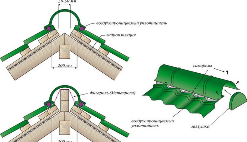 В зоне конькового узла расстояние между гидроизоляционными плёнками двух смежных скатов должно быть не менее 100–200 мм в зависимости от вида укрывного материала