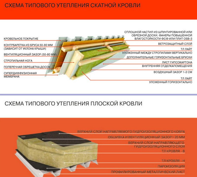Для утепления скатной кровли теплоизоляция прокладывается плотно между стропильными ногами с обязательным формированием вентиляционного зазора, а на плоской кровли из-за отсутствия стропильной системы вентиляцию подкровельного пространства обеспечивают аэраторы