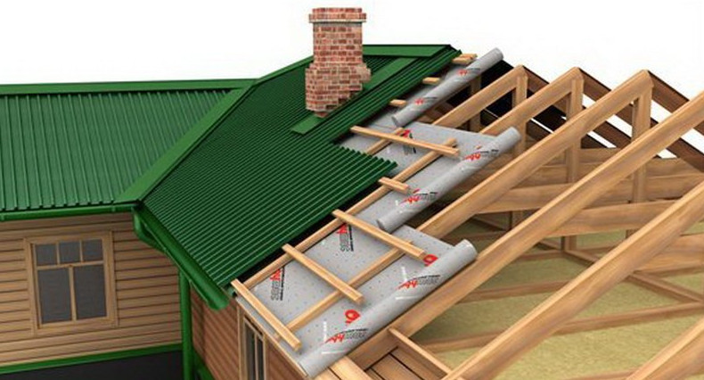 Гидроизоляция прокладывается по стропильным ногам, фиксируется рейками и обрешёткой, благодаря чему формируется необходимый вентиляционный канал между гидроизолятором и укрывным настилом