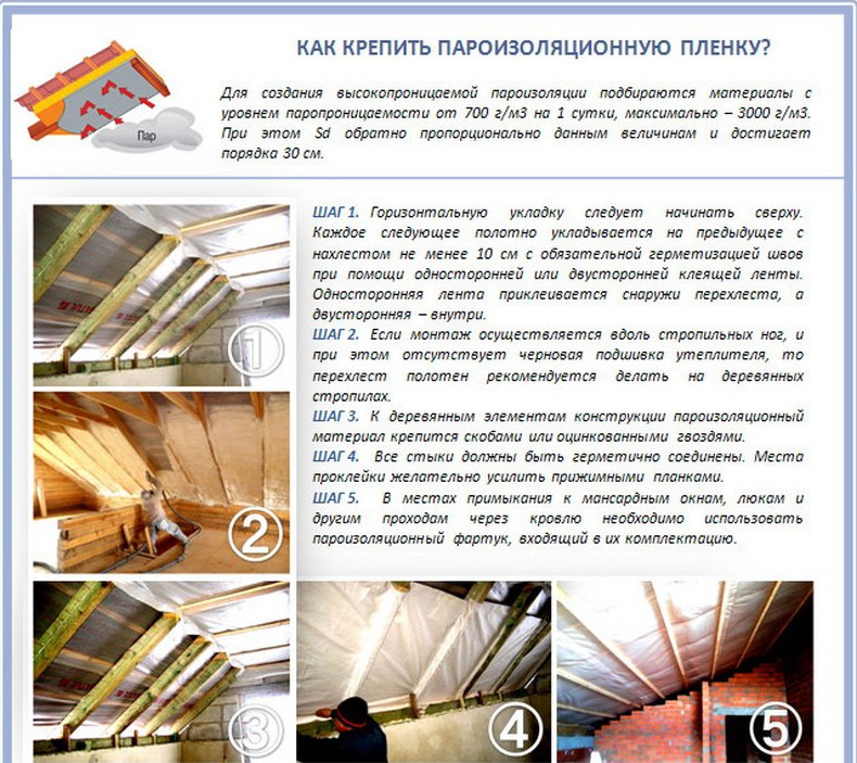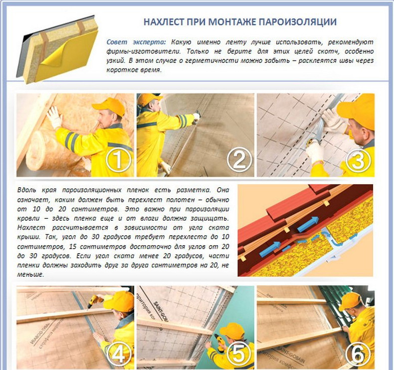 Пароизоляционные материалы укладываются с нахлёстами, рекомендуемыми изготовителями, все стыки тщательно проклеиваются, чтобы получился абсолютно герметичный настил