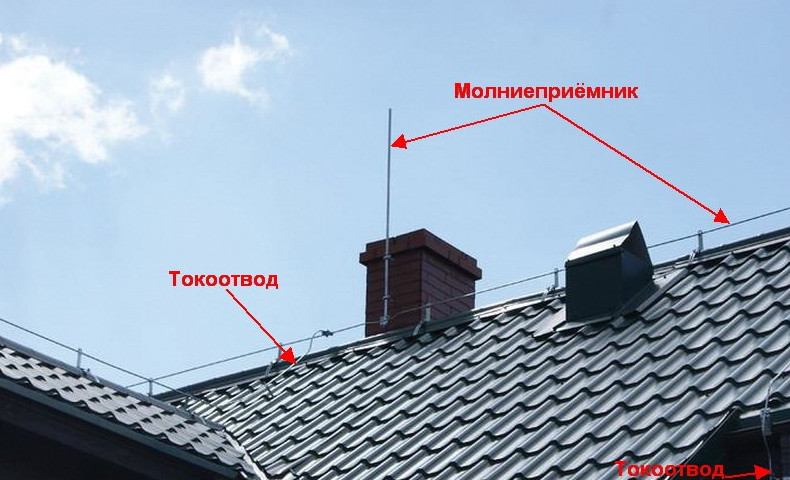 Дома с металлической кровлей в установке громоотводов не нуждаются, для них достаточно обеспечить наличие токоотвода из тонкой стальной проволоки и его заземление