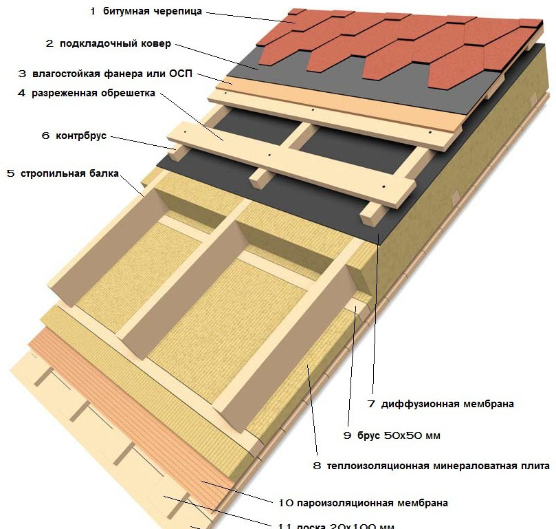 Кровельный пирог утеплённого жилого дома состоит из нескольких слоёв