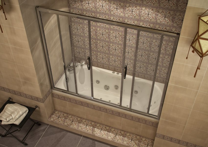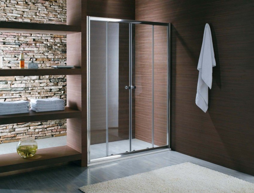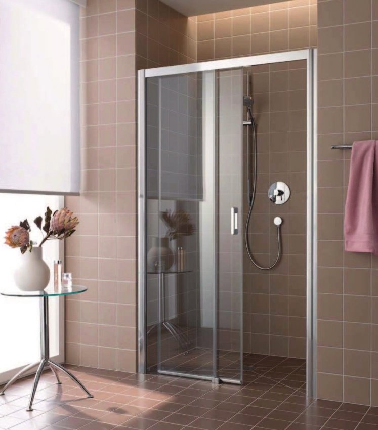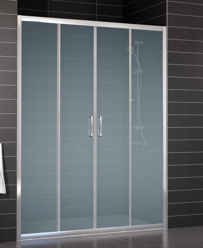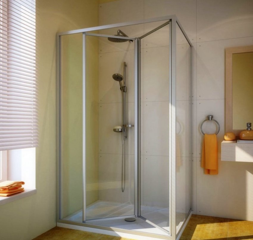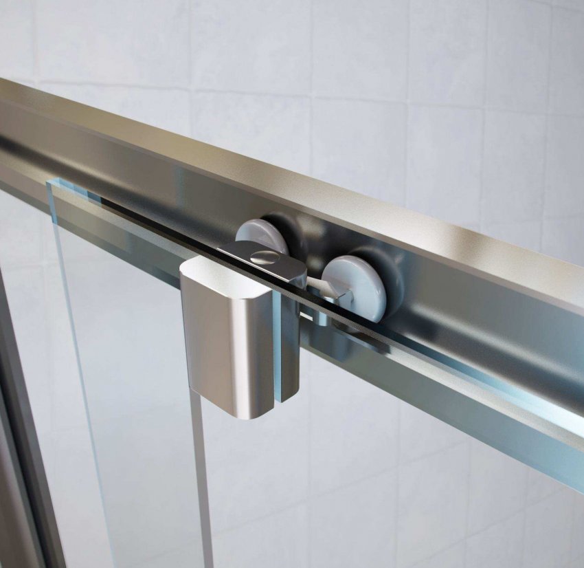 Полотно раздвижной конструкции двигается на роликах по специальным рельсам вдоль стенки. Такая дверь наиболее распространена в установке для душевых кабин и стандартных ванн, хотя уместна и в душевых нишах.