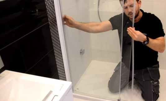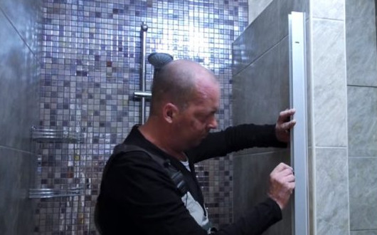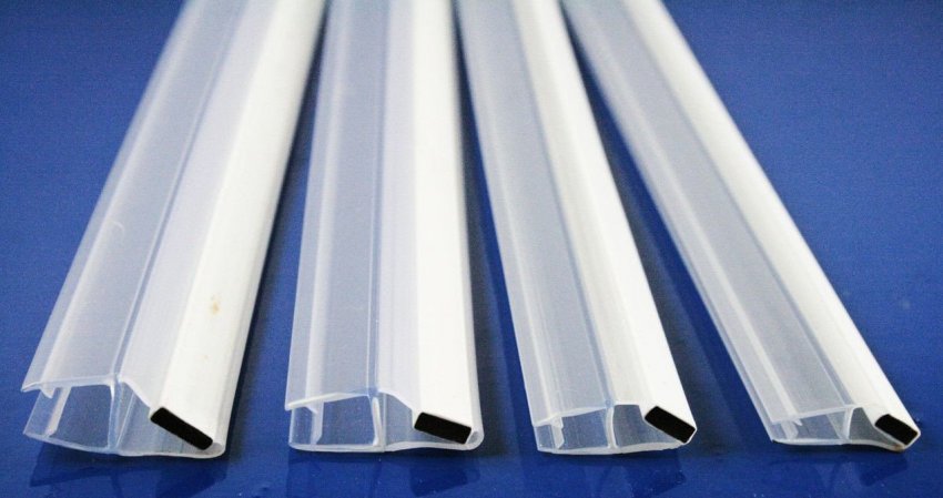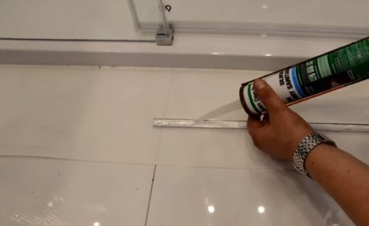 - Прикрепите узкий нижний профиль в месте порога двери. Для недопущения протечек воды с внутренней стороны нанесите на него антибактериальный силикон.