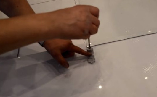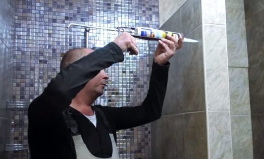 - Фиксация профиля. Обратную сторону профилей смазываем герметиком с антибактериальным эффектом, чтобы вода не протекала сквозь плиточные швы.
