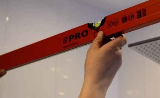 - Разметка положения профиля. Отмечаем расположение вертикальной направляющей на стенке в нише. Здесь стоит воспользоваться уровнем. Нужно очень ответственно подойти к этому моменту, так как ошибки чреваты негативными последствиями: неправильная разметка сделает внешний вид ниши неэстетичным, лишние отверстия заделать довольно сложно.