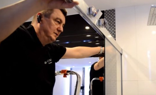 - Установка полотна. Устанавливаем и прикручиваем направляющую, вставляем в неё стекло. Следим за совпадением петель и технологических гнёзд, чтобы дверь надёжно держалась и хорошо открывалась. Фиксируем петли с помощью специальных зажимов.