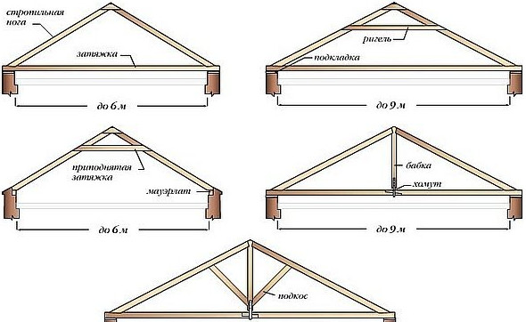 - Если длина пролёта до 6 м, нагрузка небольшая и элементов совсем немного. Это могут быть стропильные ноги с затяжкой внизу или вверху (приподнятой затяжкой).