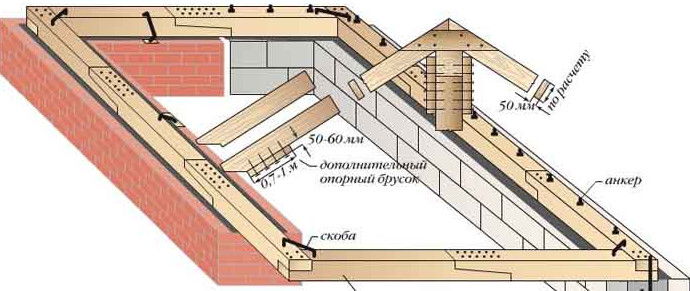 Мауэрлат укладывается на верхние торцевые части всех стен и в углах соединяется металлическими скобами