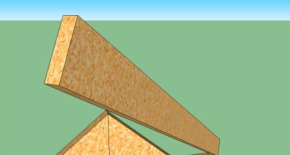 - После этого необходима доска сечением 50х200. Укладываем её одним концом на вершину конька, а другим — на угол только что отрезанного бруска, делаем разметку. Для удобства эту работу лучше выполнять вдвоём.