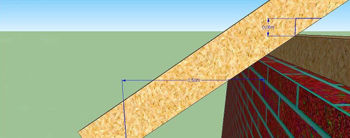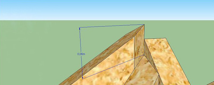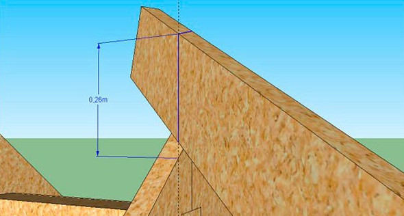 - Вверху измеряем расстояние, на которое стропило выступает над коньком. В нашем примере оно равно 6 см.