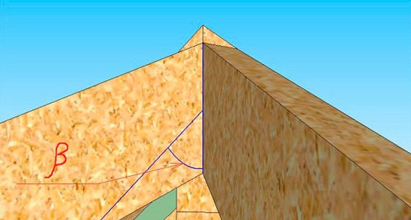 - Следует иметь в виду, что на полувальме будет находиться 4 нарожника (справа и слева по 2). Среднее стропило будет служить шаблоном, поэтому временно оно не закрепляется. Нижние запилы нарожников делаются под углом β с последующим изменением до значения ψ/2 в необходимую сторону. Все изготовленные стропила полувальм и нарожники монтируем и закрепляем.