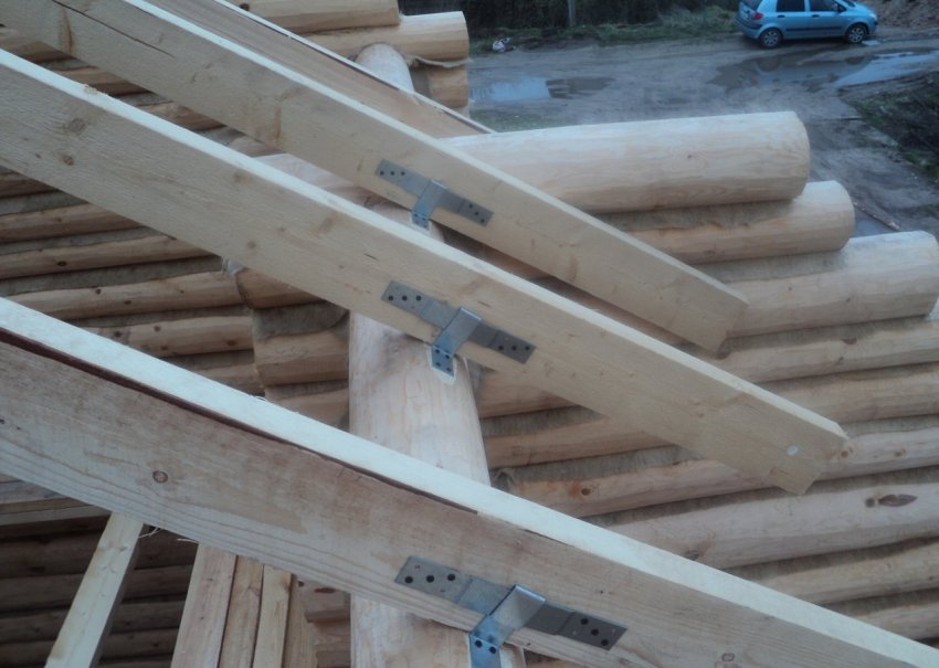 - к стропильной ноге крепится подпорный брус, длина которого равна 1 м, а для фиксации ноги по её бокам вкручиваются металлические уголки.