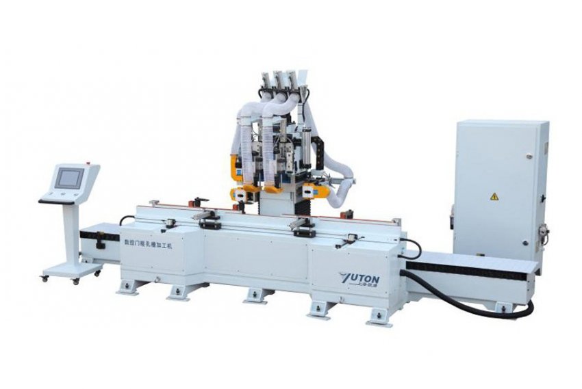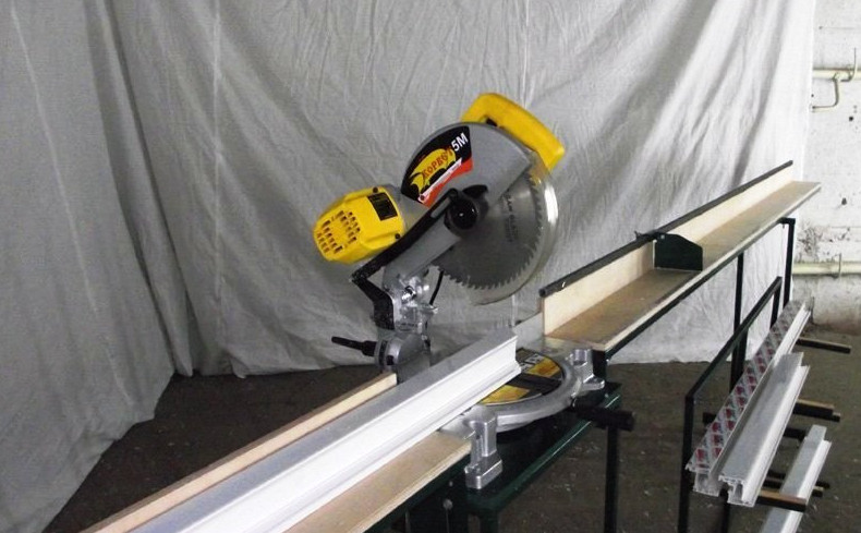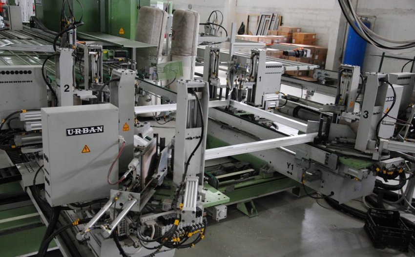 - Создание мест для крепления фурнитуры. В армированном профиле создают пазы под замки и отверстия для ручек. Делают это при помощи копировально-фрезерного станка со трёхшпиндельным редуктором, у которого верхняя платформа является подвижной, а на ней находится фреза.