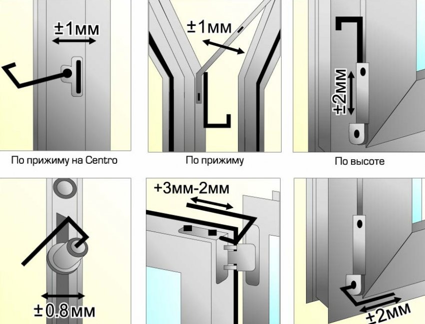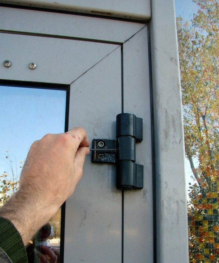 Регулировка металлопластиковой двери выполняется при помощи специальных винтов, расположенных на петлях