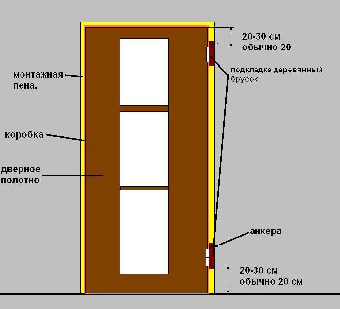 Для надёжной фиксации дверной коробки с каждой стороны устанавливают по три анкера