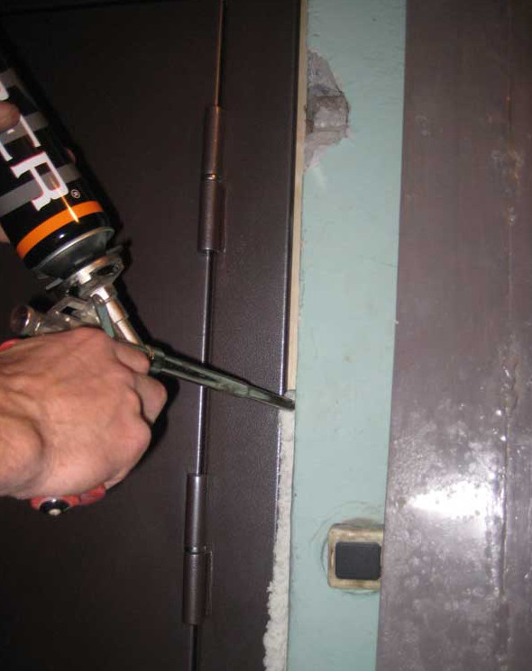 Щели между дверной коробкой и стеной заполняются монтажной пеной, которая обеспечивает герметичность всех мест стыка коробки с дверным проёмом