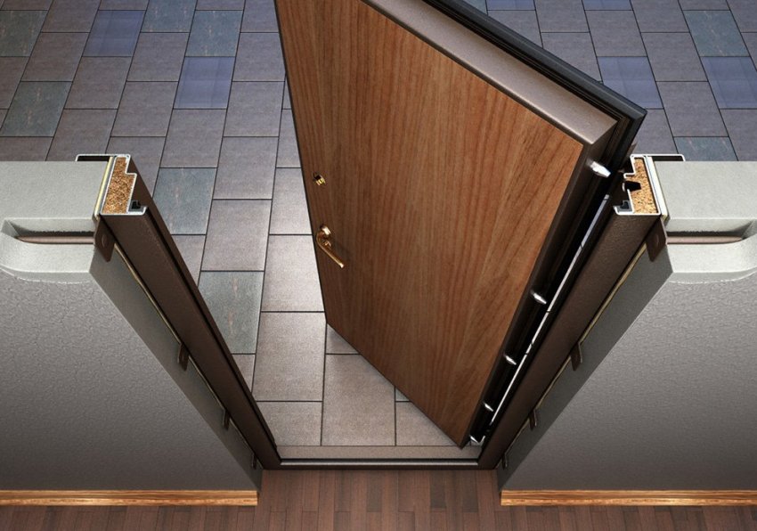 Полотно входной двери навешивается на коробку, которая должна быть идеально ровно установлена в дверном проёме