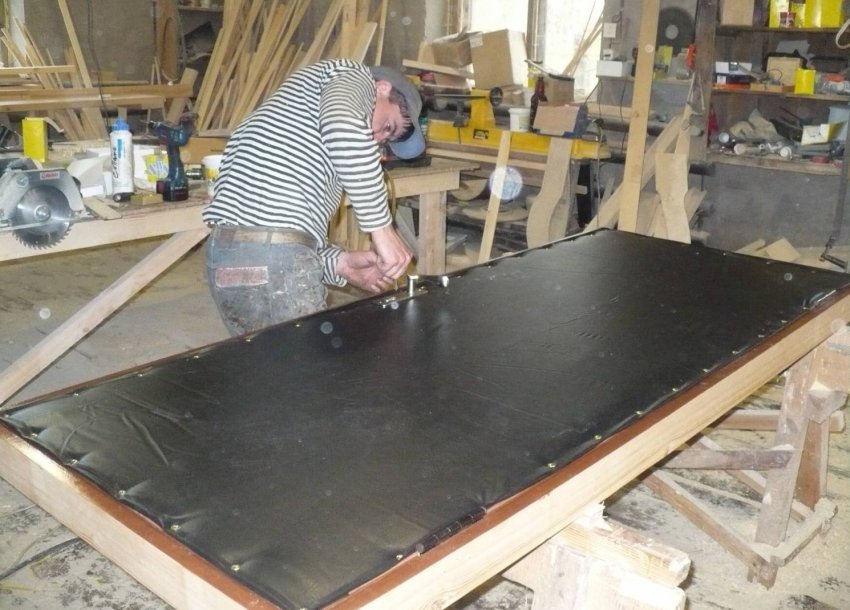 Дермантин прибивается при помощи специальных гвоздей с широкими шляпками через слой приклеенного поролона
