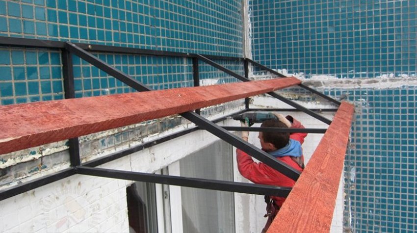 Конструкция кровли может быть независимой, в которой каркас крепится к стене дома и не взаимодействует с ограждением балкона. Если же возводится зависимый вариант, то каркас опирается на вертикальные стойки ограждения, оконные конструкции и дополнительно фиксируется на стене здания.