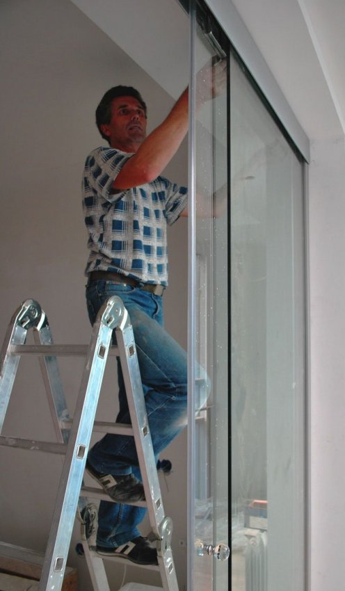 Если нужно самостоятельно установить раздвижные стеклянные двери, то стоит придерживаться той же последовательности работ, как и при монтаже любого другого полотна: