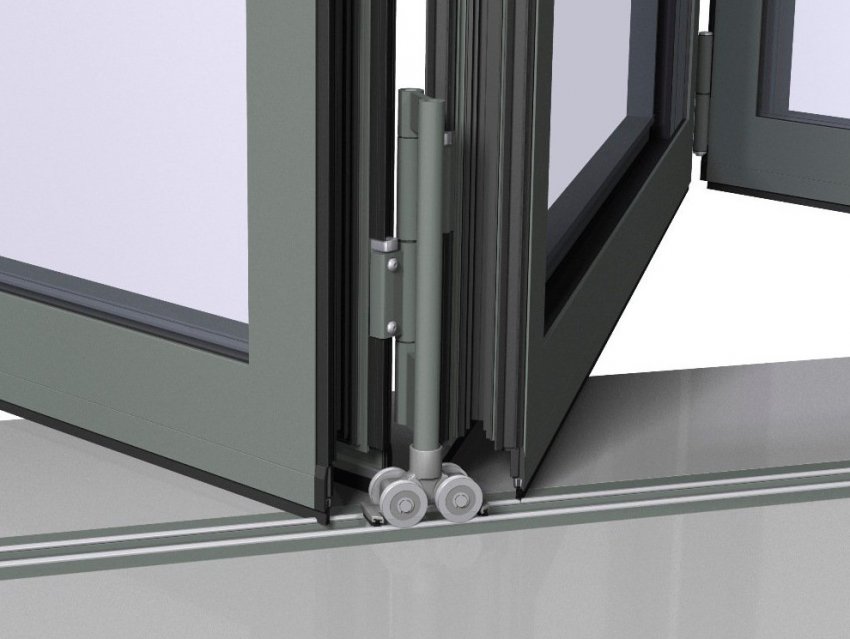На складную дверь из стеклопакетов ставятся более крупные и крепкие ролики, чтобы конструкция была надёжной