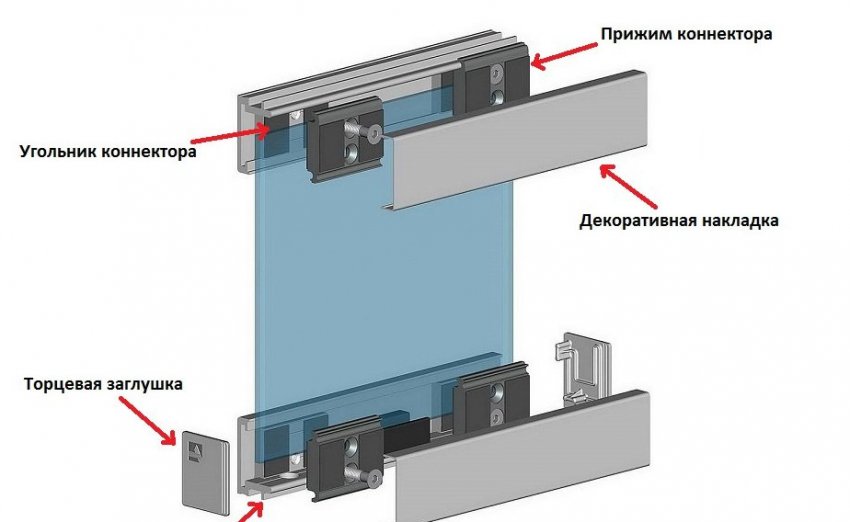 Вся фурнитура для стеклянного полотна делается из двух частей, которые обжимают стекло с обеих сторон