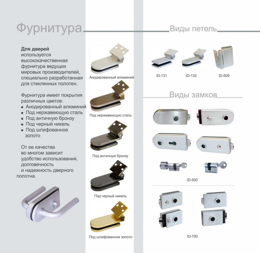 Большое значение для монтирования тяжёлых дверей из стекла имеет качественная фурнитура: она должна быть прочной и надёжной. Если такие конструкции устанавливаются в сауне, то следует подбирать материал, устойчивый к коррозии: алюминий или латунь.