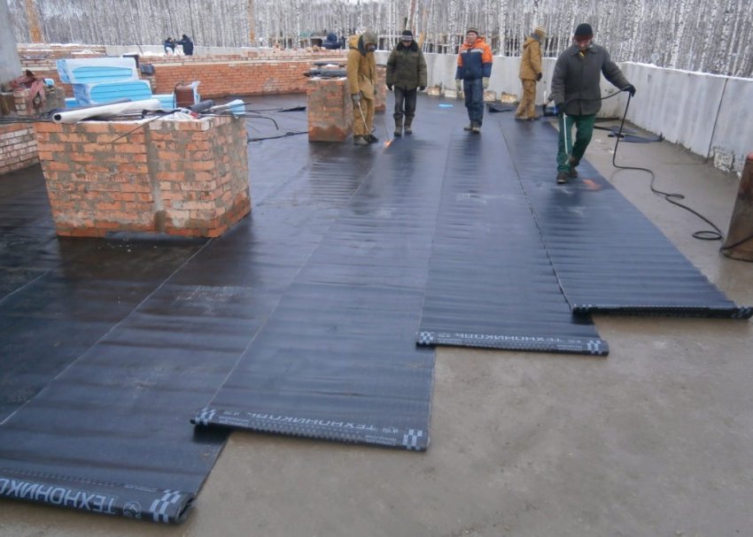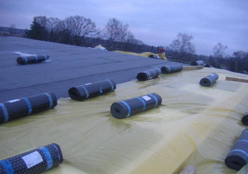 Перед укладкой также нужно обустроить гидроизоляцию основания. В гаражах и других небольших зданиях её могут и не делать, но в более ответственных строениях она обязательна, так как помогает увеличить стойкость крыши к проникновению воды. ЖБИ обычно изолируют мастикой методом напыления или просто щёткой. При засыхании она создаёт плотную монолитную плёнку, похожую на резину. Для других типов оснований более подходит нетканая мембрана или полимерная плёнка.