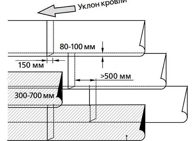 - Размер нахлёста определяется видом крыши по правилу: чем больше уклон, тем меньше нахлёст. На кровле с уклоном свыше 5° полотна внутренних слоёв накладываются на 7–8 см, а наружных — на 10–15 см. На плоской крыше нахлёст стабильный — 10 см.