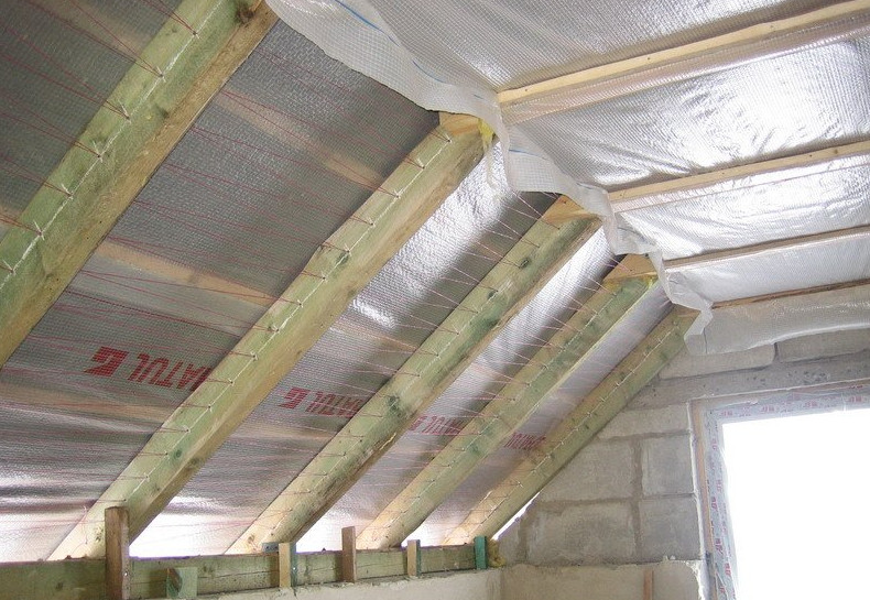 Плиты укладывают плотно, а затем набивают на стропила бруски под пароизоляцию