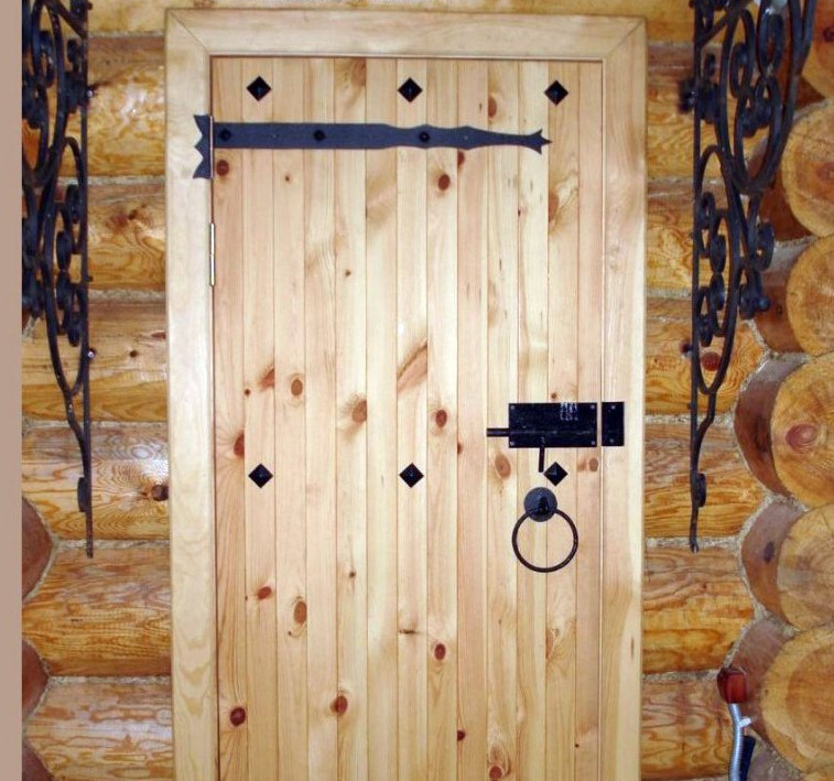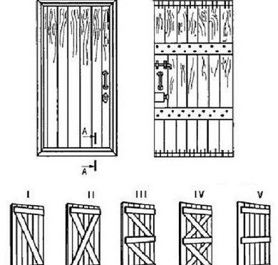 Для простых хозяйственных нужд необязательно собирать филёнчатую дверь со сложными конструктивными элементами. В подсобку или сарай вполне сгодится дверь щитового типа, состоящая из сборного полотна и дощатой дверной коробки. Очень удобны в этом отношении двери, изготовленные из вагонки или шпунтованной доски. Эти пиломатериалы продают с уже выструганными пазами и гладкой поверхностью.