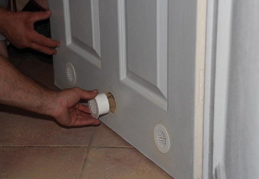 - Если в дверной створке предусмотрена вентиляционная решётка, её крепят посередине дверного полотна, на расстоянии 15–20 см от пола.