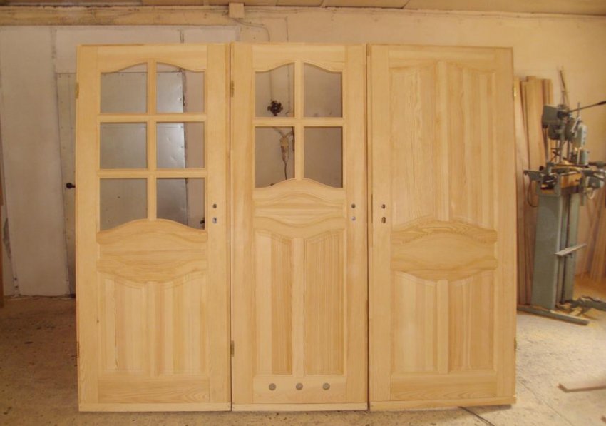 Самый доступный материал — это доски из сосны и ели. Еловые пиломатериалы более прочные, но у сосны красивей текстура и меньше сучков. Мягколиственные породы дерева — берёза, липа, тополь — практически не применяются для изготовления дверей. Большой популярностью пользуется дубовый массив. Его структура отличается прочностью и долговечностью. Однако заготовка дуба — процесс дорогостоящий, что закономерно отражается на конечной цене.