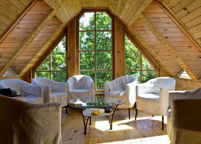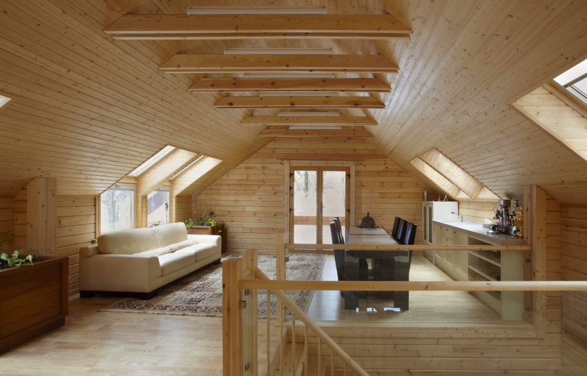 Внутренняя обшивка деревом делает мансарду тёплой и светлой