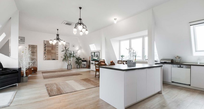 Большая мансарда позволяет поделить площадь на разные жилые зоны