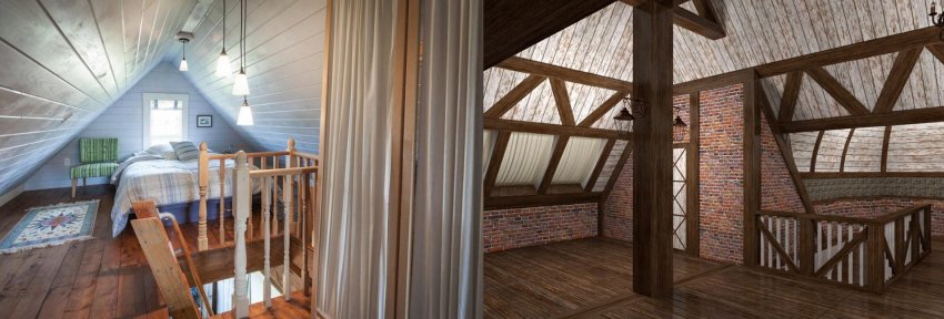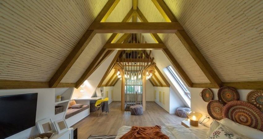 Оформление видимых частей стропил в интерьере мансарды — дело интересное и творческое