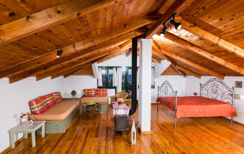 Через окна в мансарде проходит много солнечного света, освещая помещение весь день