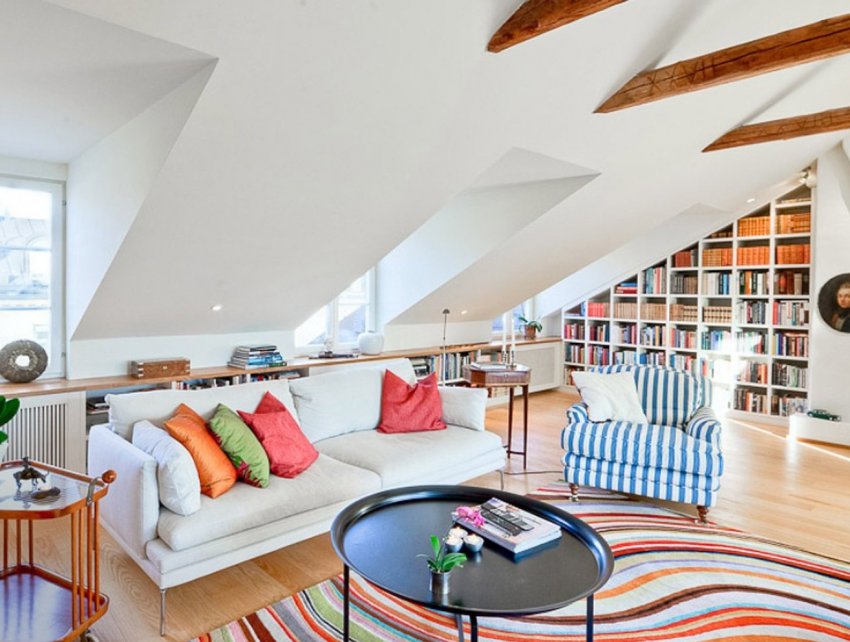 Надстройка с наклонной крышей, оформленная в светлых тонах, визуально увеличивает пространство, а цветовые пятна добавляют яркости интерьеру