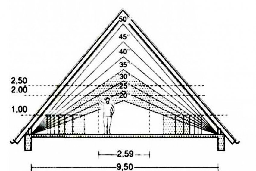 При расчёте угла наклона учитывается климатическая зона, в которой находится дом, и то, чтобы на мансарде было удобно перемещаться в полный рост