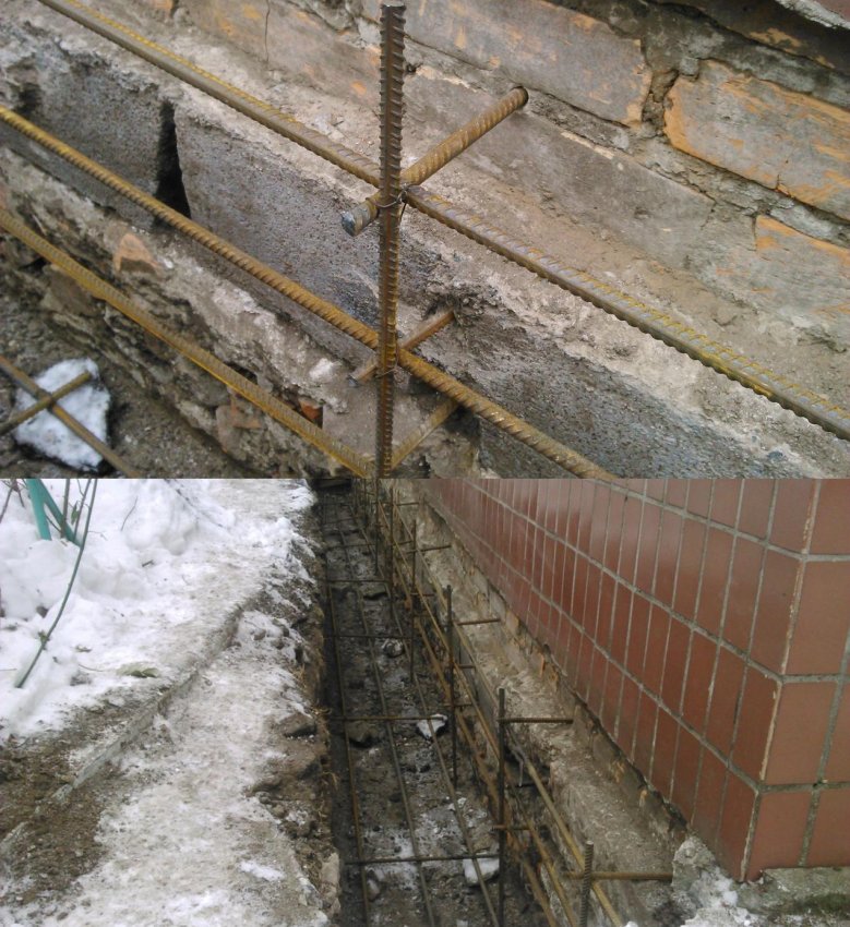 Укрепление фундамента производится методом обвязки арматурным поясом со всех сторон.