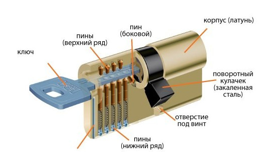 - Сувальдные замки оптимальны для входных дверей, а для межкомнатных подходят цилиндровые. Каждый из них может быть накладным или врезным. В первом случае механизм в корпусе просто прикручивают к полотну в нужном месте, делая отверстия для ключа. Врезной вариант требует создания большого углубления в кромке двери, достаточного для размещения внутреннего механизма.