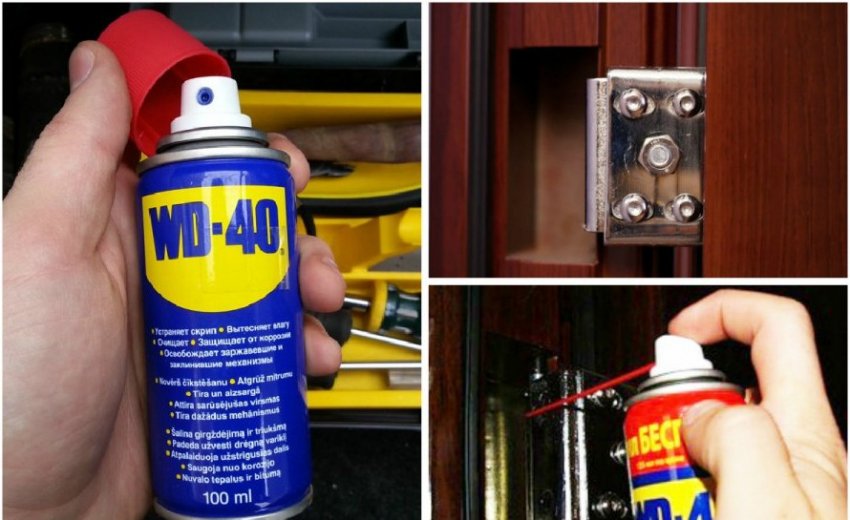 - Скрип петель или замка устраняют методом нанесения в механизм солидола или специальных составов.